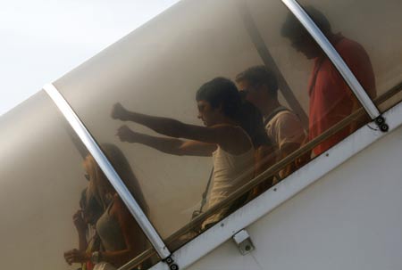 A man raises his arms after exiting a Thai Airways flight, the first to land at Bangkok's Suvarnabhumi Airport December 3, 2008, after a week-long anti-government protest paralyzed air travel. Anti-government protesters lifted their crippling, eight-day blockade of Thailand's main airport on Wednesday, raising the hopes of 230,000 stranded tourists even though there is no end in sight to the wider political crisis. The passengers were arriving from Phuket. [Agencies]