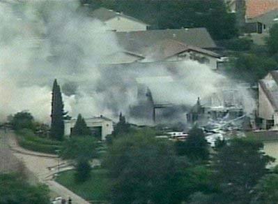 This video frame grab image taken from KGTV television shows the scene where an F18 military jet crashed in a San Diego neighborhood, Monday December, 8, 2008, sparking at least one house fire. [Agencies]