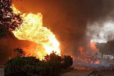 Fire rages in a neighborhood in the University City area in San Diego, California. A military F18 jet crashed into a residential neighborhood in California on Monday but there were no immediate reports of injuries, aviation and military officials said. [Agencies]