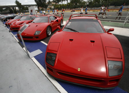 Ferrari cars, including the F40 (R and 2nd R), F50 (2nd L) and Enzo sit on display during a show of luxury cars in Singapore December 7, 2008. For the truly wealthy, there's no such thing as a bad time to buy a supercar, even when the rest of the world is panicking about a global recession -- or so a Singaporean luxury car importer hopes. [Agenices]