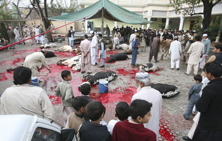 People gather as men slaughter cows during the Eid-al-Adha festival in Rawalpindi December 9, 2008. Pakistani Muslims celebrate Eid al-Adha to mark the end of the haj by slaughtering sheep, goats, camels and cows to commemorate Prophet Abraham's willingness to sacrifice his son Ismail on God's command. [Agenices]