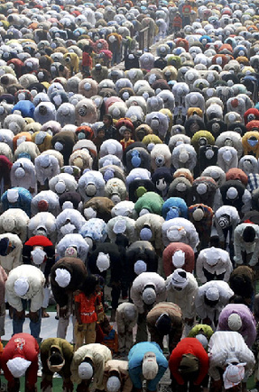 Muslims offer Eid al-Adha prayers in the northern Indian city of Mathura December 9, 2008. Muslims around the world celebrate Eid al-Adha by the sacrificial killing of sheep, goats, cows and camels to commemorate Prophet Abraham's willingness to sacrifice his son, Ismail on God's command. [Agencies]