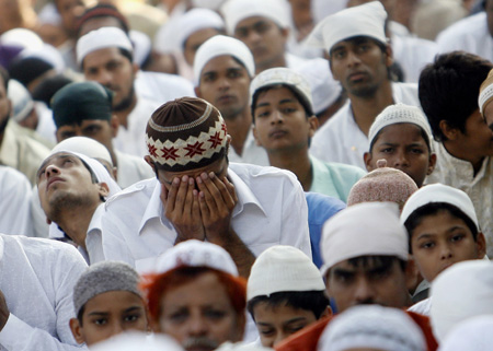 Muslims pray to mark Eid al-Adha on a street in Mumbai December 9, 2008. Muslims around the world are celebrating Eid-al-Adha, marking the end of the haj, by slaughtering sheep, goats, cows and camels to commemorate Prophet Abraham's willingness to sacrifice his son Ismail on God's command. [Agencies]