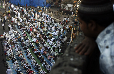 Muslims pray to mark Eid al-Adha on a street in Mumbai December 9, 2008. Muslims around the world are celebrating Eid-al-Adha, marking the end of the haj, by slaughtering sheep, goats, cows and camels to commemorate Prophet Abraham's willingness to sacrifice his son Ismail on God's command. [Agencies]