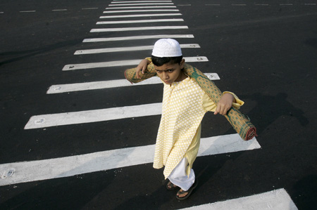 A Muslim boy walks to attend Eid al-Adha prayers in the eastern Indian city of Kolkata December 9, 2008. Muslims around the world celebrate Eid al-Adha by the sacrificial killing of sheep, goats, cows and camels to commemorate Prophet Abraham's willingness to sacrifice his son, Ismail on God's command. [Agencies]