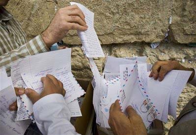 Israel Postal Company employees hold letters written and addressed to God as they place them into cracks in the Western Wall, Judaism's holiest site, in Jerusalem's Old City, Tuesday, December 9 2008. An Israeli rabbi and postal official have delivered hundreds of letters from across the world to their destination, the Western Wall in Jerusalem. Every year Israeli officials bring letters addressed to the wall or to God and stuff them into the cracks between the stones in the wall. [Agencies]