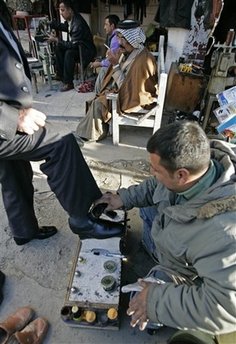 A man gets a shoe shine in Baghdad, Iraq, Monday, Dec. 15, 2008. Iraqi journalist Muntadar al-Zeidi threw his shoes at President George W. Bush during a press conference in Baghdad on Sunday, while yelling in Arabic. [Agencies]