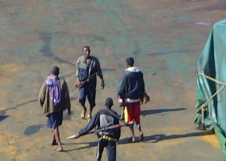 Pirates board the deck of the Chinese ship "Zhenhua 4" in the Gulf of Aden, on December 17, 2008. [Xinhua]