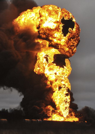Railroad tanks containing gasoline burn near Ventspils, about 200 km (124 miles) from Riga, December 20, 2008. A train carrying fuel tanks collided into a stationary train on Saturday morning causing an explosion, local media reported. [Agencies]