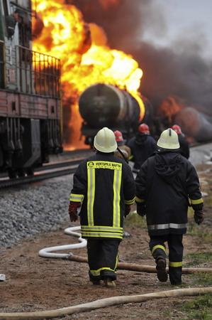 ![]() Emergency specialists work on site while 10 railroad tanks containing gasoline burn near Ventspils, about 200 km (124 miles) from Riga, December 20, 2008. A train carrying fuel tanks collided into a stationary train on Saturday morning causing an explosion, local media reported. [Agencies]