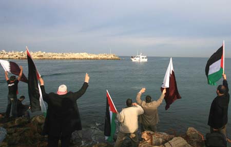 Palestinian wave flags as they welcome the arrival of a boat chartered by Free Gaza Movement, at the fishing port of the Gaza Strip, December 20, 2008. The ship is the fifth initiative to break Israel's naval blockade on Gaza Strip. [Xinhua]