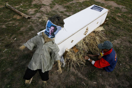 A supporter of Thailand's ousted Prime Minister Thaksin Shinawatra prepares to set fire to a coffin and an effigy of new Prime Minister Abhisit Vejjajiva in Udon Thani province, about 580 km (360 miles) east of Bangkok, December 22, 2008. The protesters accused the military of intervening in the formation of the new coalition government. [Agencies]