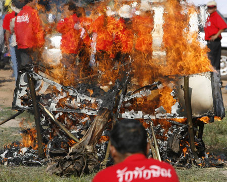 Updated: 2008-12-22 15:30 Supporters of Thailand's ousted Prime Minister Thaksin Shinawatra set fire to a coffin and an effigy of new Prime Minister Abhisit Vejjajiva in Udon Thani province, about 580 km (360 miles) east of Bangkok, December 22, 2008. The protesters accused the military of intervening in the formation of the new coalition government. [Agencies] |