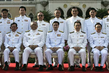 Members of Thailand's new cabinet take a group photo at the Government House in Bangkok December 22, 2008. New Thai Prime Minister Abhisit Vejjajiva unveiled a cabinet on Saturday including several ministers criticised for lack of experience and a foreign minister closely tied to this year's street protests. [Xinhua/Reuters]