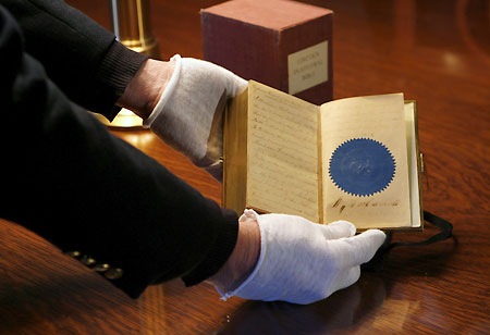 The Bible upon which US President Abraham Lincoln was sworn in for his first inauguration is displayed at the Library of Congress in Washington December 23, 2008. On January 20, 2009, President-elect Obama will take the oath of office using the same Bible Lincoln used. [Agencies]