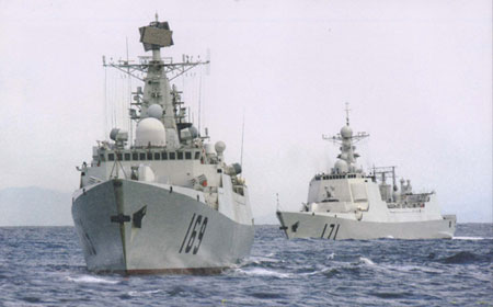 ![]() An undated photo shows Chinese navy destroyer 169 Wuhan and destroyer 171 Haikou during a drill before leaving for Somali waters to fight pirates. [chinamil.com]