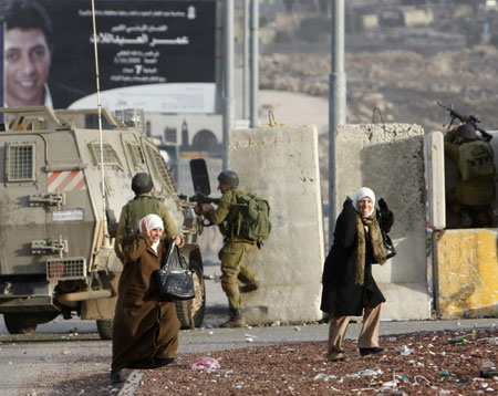 Palestinian woman run for cover during scuffles between Palestinian stone-throwers and Israeli troops at Qalandiya checkpoint near the West Bank city of Ramallah December 27, 2008. Israeli warplanes and helicopters pounded the Hamas-ruled Gaza Strip on Saturday, killing more than 230 people in the bloodiest one-day death toll in 60 years of conflict with the Palestinians. Palestinians staged protest rallies in Arab East Jerusalem, and in the West Bank cities of Ramallah and Hebron, leading to scuffles with Israeli forces. [Agencies]