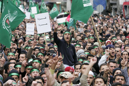 Updated: 2008-12-28 10:17 Protesters shout anti-Israel and anti-US slogans during a demonstration against Israeli air strikes in the Gaza Strip in Amman December 27, 2008. Israeli warplanes and helicopters pounded the Hamas-ruled Gaza Strip on Saturday, killing at least 230 people in one of the bloodiest days in the Palestinians' conflict with Israel. [Agencies]