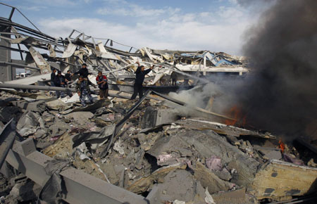 Updated: 2008-12-28 10:17 Palestinians inspects a destroyed Hamas police compounds following an Israeli air strike in Gaza December 27, 2008. Israeli warplanes and combat helicopters pounded the Hamas-ruled Gaza Strip on Saturday, killing more than 230 people in the bloodiest day for Palestinians in more than 20 years. Palestinian militants responded with rocket salvoes that killed an Israeli man and wounded several others, medics said. [Agencies] Israeli assault on Gaza kills over 200