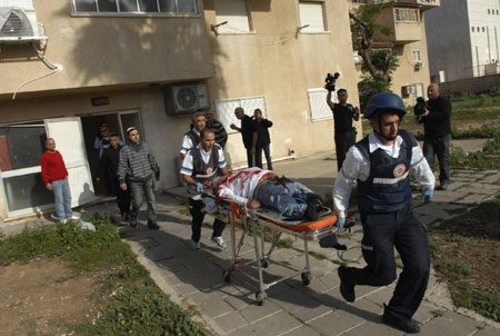 A wounded Israeli man, who later died in hospital, is taken away on a stretcher from the scene of a rocket attack in the southern city of Netivot December 27, 2008. Israeli warplanes and combat helicopters pounded the Hamas-ruled Gaza Strip on Saturday, killing more than 230 people in the bloodiest day for Palestinians in more than 20 years. Palestinian militants responded with rocket salvoes that killed an Israeli man and wounded several others, medics said. [Agencies]