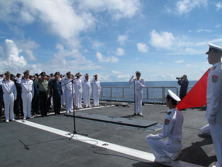 Sailors take an oath on the deck of a missile destroyer of the Chinese naval fleet on an anti-piracy mission off Somalia on December 28, 2008, two days after departure from Sanya, south China's Hainan province. The naval fleet is expected to sail through the Singapore Strait and the Strait of Malacca on December 29, 2008 and arrive in the Gulf of Aden on January 6, 2009. [Wang Hui/chinadaily.com.cn]