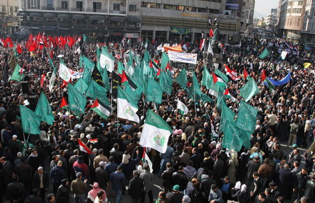 Protesters demonstrate in Damascus December 28, 2008 against the Israeli air strikes on Gaza. Israel destroyed Hamas's main Gaza security complex in an air strike on Sunday and prepared for a possible invasion of the territory after killing more than 280 Palestinians in the first 24 hours of a powerful offensive. [Agencies]