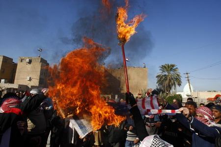 Demonstrators burn Israeli and US flags during a protest in eastern Baghdad's Baladiyat district December 28, 2008. Protestors burned Israeli flags and fired AK-47s into the air in protests across Iraq on Sunday, demanding a stronger response from Arab nations to Israeli air strikes that killed more than 270 people in Gaza. [Agencies]