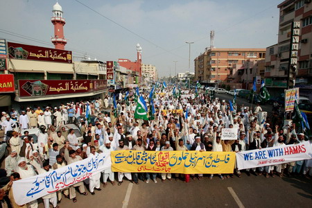 Supporters of Pakistani Islamists party Jamaat-e-Islami chant slogans against the Israeli air strikes on Gaza during a protest rally in Karachi December 28, 2008. [Agencies]