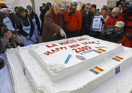 Bucharest's mayor Sorin Oprescu cuts a fruit and cream cake in Bucharest during a Guinness World Record event for the world's heaviest cake December 28, 2008. The cake which weighs 281kg (about 619 pounds) set a new world record. [Agencies]