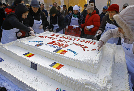 Officials prepare to serve a fruit and cream cake in Bucharest during a Guinness World Record event for the world's heaviest cake December 28, 2008. The cake which weighs 281kg (about 619 pounds) set a new world record. [Agencies]