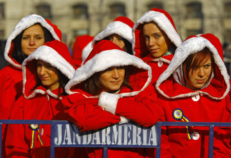 Girls dress as Santa Claus in Bucharest during a Guinness World Record event for the world's heaviest cake December 28, 2008. The cake which weighs 281kg (about 619 pounds) set a new world record. [Agencies]