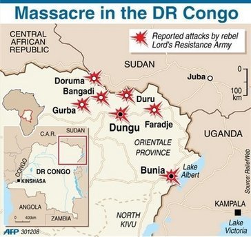 Caritas workers say that "over 400 people have been killed in the attacks in an area of northern Congo including Faradje, Duru, Gurba, Doruma, and Province Orientale," it added. The archbishop of Dungu-Doruma, Monsignor Richard Domba, said at least 150 people had been killed at a Christmas Day service at Faradje and later, 80 at Duru and at least 200 others at Doruma and in the surrounding villages, AFP reported. "It is a dramatic situation that we are living through here," he said. The rebels "are indescribably barbarous and savage. "They kill with machetes, axes and clubs. They burn people alive with their property in their homes." The LRA also "captured young boys and girls whom they will conscript and force to work in their fields," he said. In Bangadi, near the border with Sudan, 48 people died, and in Gurba 213 people were killed. Approximately 6,500 people have found refuge in the area with the Catholic church, Caritas said. "The rebels have committed terrible acts of violence," said the director of Caritas in Dungu-Doruma, Abbe Come Mbolingaba. "They decapitated several people. In the villages hardly anybody is moving. "Everyone is in psychological shock. The death toll could be above 400 because it is difficult to find all the bodies." Aid workers are worried by the lack of access in the region to local people who are wandering in search of shelter and help.