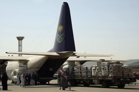 Emergency aid and goods are loaded onto a cargo plane bound for Gaza in response to the recent air-strikes, from Riyadh's airbase in Saudi Arabia December 30, 2008. [Agencies]