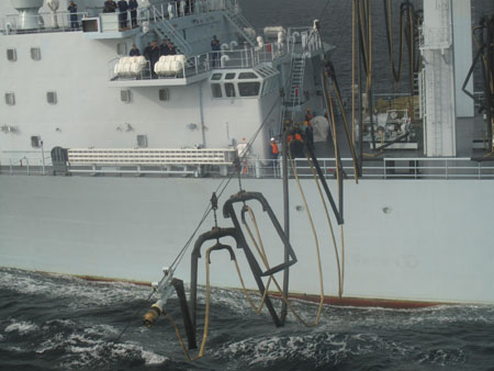 Updated: 2008-12-31 16:51 The oil pipe and the water pipe slide from the supply ship Weishanhu down a rope to the flagship Wuhan during the Chinese naval fleet's first at-sea replenishment on their escort mission against pirates off Somalia, December 30, 2008. [Wang Hui/chinadaily.com.cn] |