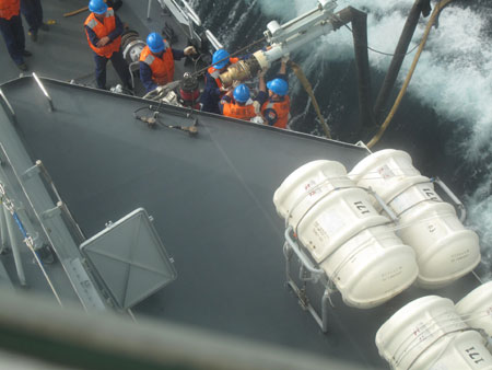 ![]() Naval soldiers conjoin the missile destroyer Haikou with the supply ship Weishanhu during the Chinese naval fleet's first at-sea replenishment on their escort mission against pirates off Somalia, December 30, 2008. [Wang Hui/chinadaily.com.cn]