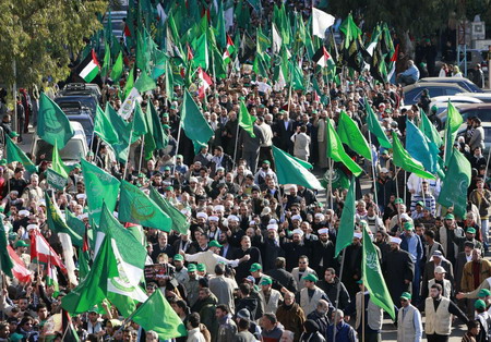 Members of the Lebanese Islamist group "al-Gama'a al Islamiya" march towards the UN headquarters in Beirut to protest against Israel's attacks on Gaza January 4, 2009. [Agencies]