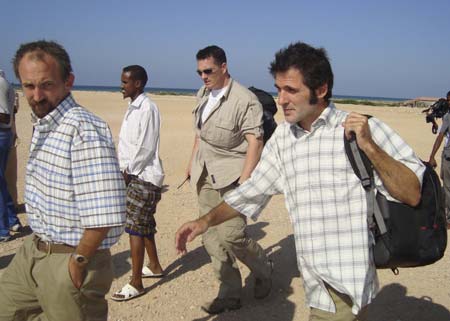 Colin Freeman (L) and Jose Cendon (R) walk together in Bosasso airport, January 4, 2009. Somalia kidnappers have freed two journalists, British correspondent Freeman and Spanish photographer Cendon, a government official said on Sunday. [Agencies]
