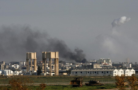 An airstrike hit another ambulance belonging to the Hamas-run Health Ministry in Gaza City, killing three other paramedics, said medic Jamal Hawajiri. That ambulance crew was driving to a Hamas training site where there were reports of wounded. An Israeli army spokesman said he had no information on the incidents. The Israeli army said it had killed dozens of armed Hamas gunmen, but Gaza officials could confirm only a handful of dead fighters, in part because rescue teams could not reach the battle zones. Condemnation of Israel's ground operation poured in from the Middle East and Europe. "The violence has to stop," said EU External Relations Commissioner Benita Ferrero-Waldner. French President Nicolas Sarkozy scheduled talks Monday with Israeli and Palestinian leaders. While blaming Hamas for causing Palestinian suffering with rocket fire that led to the Israeli offensive, Sarkozy has condemned Israel's use of ground troops, reflecting general world opinion. Sarkozy and other diplomats making their way to the region are expected to press hard for a ceasefire. Israel has four main demands: an end to Gaza rocket fire, a halt to Palestinian attacks, international supervision of a truce and an agreement to stop Hamas from re-arming. Hamas demands a cessation of Israeli attacks and opening of vital Gaza-Israel cargo crossings, Gaza's main lifeline. US officials maintained their firm support for Israel and squarely blamed Hamas. Vice President Dick Cheney said Israel "didn't seek clearance or approval from us" before pushing into Gaza. Sens. Harry Reid and Dick Durbin, the top two Democrats in the chamber, and Senate Republican leader Mitch McConnell all described Israel's actions as understandable. "I think what the Israelis are doing is very important," Reid said. "I think this terrorist organization, Hamas, has got to be put away. They've got to come to their senses." Israeli President Shimon Peres said that Israel had to push forward and that a ceasefire was pointless without a halt to Hamas rocket fire. "Well, clearly, if there is somebody (who) can stop terror with a different strategy, we shall accept it," he said on ABC's "This Week." "We shall not accept the idea that Hamas will continue to fire and we shall declare a ceasefire. It does not make any sense." Palestinians said the Israeli military broke into broadcasts on the Hamas TV channel, Al Aqsa, appealing to Palestinians not to agree to serve as human shields for the militants. The message read, "Israel is acting only against Hamas and has no interest in harming you." The ground operation is the second phase in an offensive that began as a weeklong aerial onslaught aimed at halting Hamas rocket fire that has reached deeper and deeper into Israel, threatening major cities and one-eighth of Israel's population of 7 million. More than 45 rockets and mortar shells fell in Israel on Sunday morning, sending residents scrambling for bomb shelters. Four Israelis were lightly wounded. In Gaza City, civilians cowered inside as battles raged, while terrified residents in other areas fled in fear. In the southern town of Rafah, one man loaded a donkey cart with mattresses and blankets preparing to flee. Lubna Karam, 28, said she and the other nine members of her family spent the night huddled in the hallway of their Gaza City home. The windows of the house were blown out days earlier in an Israeli airstrike, and the family has been without electricity for a week, surviving without heat and eating cold food. "We keep hearing the sounds of airplanes and we don't know if we'll live until tomorrow or not," she said. Severe damage to Gaza's phone network was pushing the territory closer to complete isolation. The Palestinian phone company Paltel Group said 90 percent of Gaza's cellular service was down, as well as many landlines, because of frequent power cuts and the inability of technicians to reach work sites. In his first public comments on the operation, Israeli Prime Minister Ehud Olmert told his Cabinet Sunday that Israel could not allow its civilians to continue to be targeted by rockets from Gaza. "This operation was unavoidable," he said. Military intelligence chief Maj. Gen. Amos Yadlin told the Cabinet Hamas was using mosques, public institutions and private houses as ammunition stores, Cabinet secretary Oved Yehezkel told reporters. Israel approved the mobilization of thousands more reservists in addition to tens of thousands called up on Saturday. Defense officials said the extra forces could enable a far broader ground offensive. The troops could also be used in the event Palestinian militants in the West Bank or Hezbollah guerrillas in Lebanon launch attacks, as Hezbollah did in 2006 when Israel was in the midst of a large operation in Gaza.