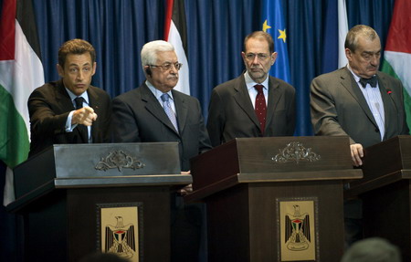 France's President Nicolas Sarkozy, Palestinian President Mahmoud Abbas, EU Foreign Policy Chief Javier Solana and Czech Republic Foreign Affairs Minister Karel Schwarzenberg (L-R) attend a news conference in the West Bank city of Ramallah January 5, 2009. [Agencies]