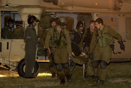 An Israeli soldier, wounded during Israel's offensive in Gaza, is carried off an Israeli air force helicopter to Soroka hospital in the southern city of Beersheba January 5, 2009. [Agencies]