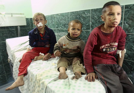 Palestinian boys wounded by an Israeli tank shell wait for treatment at Shifa hospital in Gaza January 5, 2009. At least three children were among a dozen Palestinian civilians killed on Monday as Israeli troops pressed home a ground assault on Hamas militants in the face of French-led diplomatic efforts to broker a ceasefire. The deaths included three children from the Samouni family and their mother when a tank shell hit their home in Gaza city, Palestinian medics said. [Agencies]