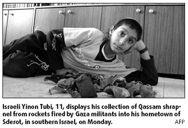 Updated: 2009-01-07 11:59 SDEROT, Israel: As police and onlookers stare at the damage caused by the latest Gaza rocket to slam into this southern Israeli town, no one pays attention to the small boy clambering over the fence and kicking through the debris. Deep in concentration, 11-year-old Yinon Tubi peers under bushes and sifts through the rubble as he scours the garden for any leftover remains of the Qassam rocket fired by militants in Gaza a few km away. Within minutes, he has assembled an impressive collection of twisted fragments on the garden wall. "As soon as a Qassam hits, we start looking for shrapnel for souvenirs," he says, proudly holding up a battered army-issue ammunition box in which he keeps his collection - the remains of more than 50 different rockets.