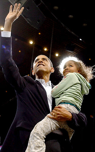 Obama gives Sasha a lift while waving to supporters after a rally in Ames, Iowa, on Feb 11, 2007, the day after he formally announced he is seeking the Democratic nomination to become president of the United States.[Agencies]