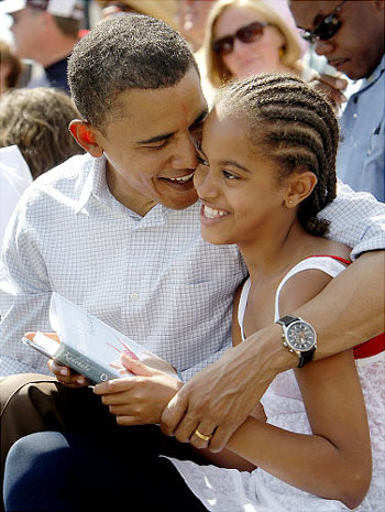 Obama hugs Malia as they watch a Fourth of July parade in Butte, Mont., Friday on July 4, 2008.[Agencies]