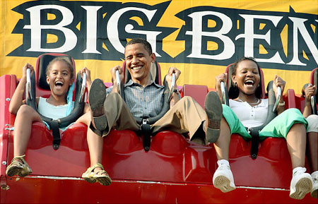Obama rides a carnival ride with Malia and Sasha at the Iowa State Fair on Aug. 16, 2007 in Des Moines, Iowa. [Agencies]