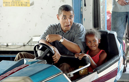 Obama rides the bumper cars with Sasha at the state fair.[Agencies]