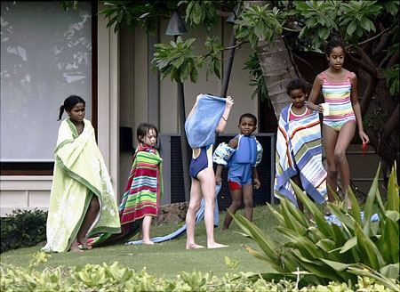 Obama's girls play with their friends over the weekend in front of an ocean-side villa in Kailua, Hawaii that the family rented for the holidays.[Agencies]