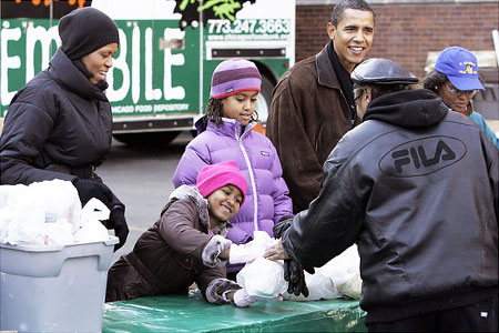 The future first daughters have plenty to be thankful for! Here they are helping less fortunate children by passing out food with their parents at St. Colmbanus Parrish and School in Chicago on Thanksgiving.[Agencies]