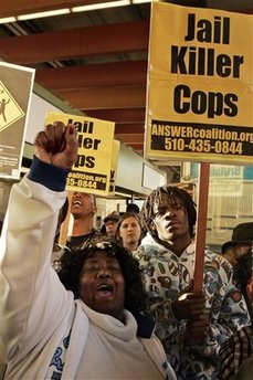 A few hundred protesters took the streets of downtown Oakland to condemn the shooting and call for criminal charges against 27-year-old officer Johannes Mehserle. Oakland police reported at least 15 arrests. Mehserle resigned from the transit agency shortly before he was supposed to be interviewed by investigators Wednesday. Mehserle is accused of shooting 22-year-old Oscar Grant of Hayward, who was lying face-down on the station platform when he was shot and killed early New Year's Day. Mehserle was one of several officers responding to reports about groups of men fighting on a train. Protesters gathered in the afternoon at the Fruitvale BART station where the shooting occurred. It was peaceful at first but began to turn nasty after a splinter group left that site and marched downtown. Protesters set fire to a trash container and tried to overturn a police car, smashing the front window. Police attempted to disperse the crowd and smaller groups of protesters marched to different areas. Some protesters threw bottles, a window of a fast-food restaurant and other downtown stores were smashed and a car was set on fire during the rampage. Police in riot gear threw tear gas to try to break up the demonstration. Oakland Mayor Ron Dellums went to the protest scene Wednesday night to urge for calm. He and several council members then led a group toward City Hall and further addressed them. "Even with our anger and our pain, let's still address each other with a degree of civility and calmness and not make this tragedy an excuse to engage in violence," Dellums said. "I don't want anybody hurt, I don't want anybody killed." Grant's family has filed a $25 million wrongful death claim against BART and want prosecutors to file criminal charges against Mehserle. |