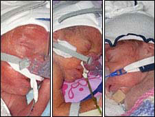 Mrs Paciuszko was told there was only a 30 per cent chance of all three surviving but they are now gaining weight and "doing well" as they are treated in three different hospitals for specialist treatment. This has meant the couple making 400-mile round trips to see each one in turn. The babies, Martha, Evie and Harry, are still in incubators in intensive care and are not expected to return home until March, the month they were originally due. Mrs Paciuszko had been told she would never conceive because her body was not producing eggs but she began fertility treatment when she married her husband Andrew, a postman. After three years of failure, Mrs Paciuszko had virtually abandoned hope until she fell pregnant last year. She gave birth by caesarean section on Dec 6. Mrs Paciuszko, from Truro, Cornwall, an administration manager for Marks & Spencer, said doctors had performed "miracles". She said: "It was a very lonely Christmas for Andrew and I because we spent it apart in different hospitals and eating microwave meals. "We have not seen each other for three weeks. Nobody can give us a guarantee that they (the babies) will be OK but it is looking very good. "The fact our babies are here at all is a miracle because we were told we could never have children. We just want to keep them safe." During the pregnancy, the couple were given the option to terminate one foetus to ensure they had at least two healthy babies, but they declined. Mrs Paciuszko gave birth at Derriford Hospital, Plymouth, Devon. A 20-strong specialist medical team delivered 1lb 13oz Harry at 10.12am, 2lb 2oz Martha at 10.14am and 1lb 12oz Evie at 10.16am. Harry remained at Derriford while Martha was transferred to Frenchay Hospital, Bristol, Bristol, for an operation on a perforated gut. Evie was taken to the Royal Cornwall Hospital, Truro, to be near her home. Harry and Evie are now both in incubators in Truro and Martha was expected to join them soon. Hospital managers said the triplets had been moved to different units because they needed specialist care. |